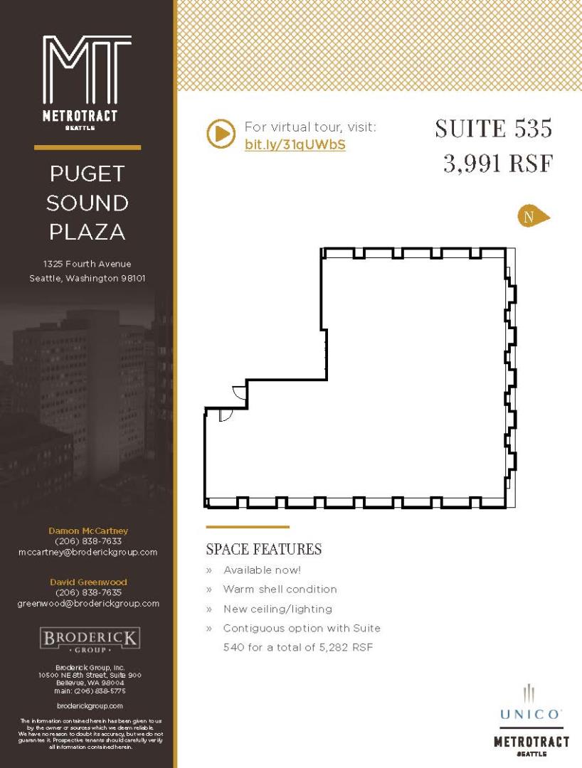 + Available now! + Warm shell condition + New ceiling/lighting + Contiguous option with Suite 540 for a total of 5,282 RSF Tax iD #: 0002400002
