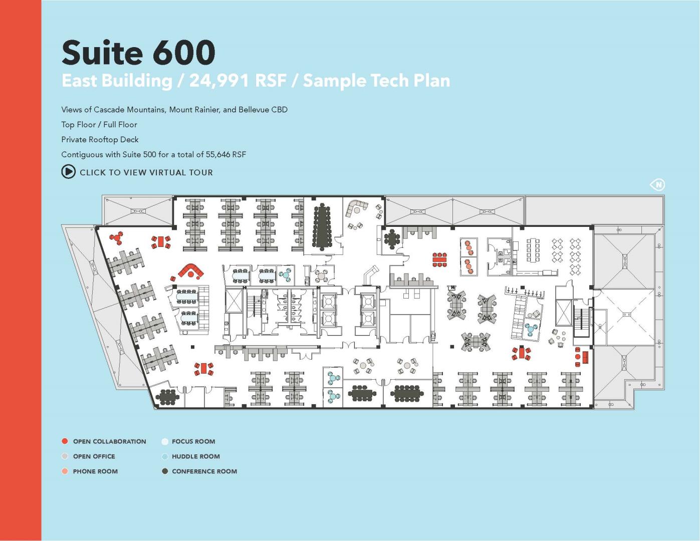 + Views of Cascade Mountains, Mount Rainier & Bellevue CBD + Top floor / Full floor + Private rooftop deck + Contiguous with Suite 500 for a total of 55,646 RSF