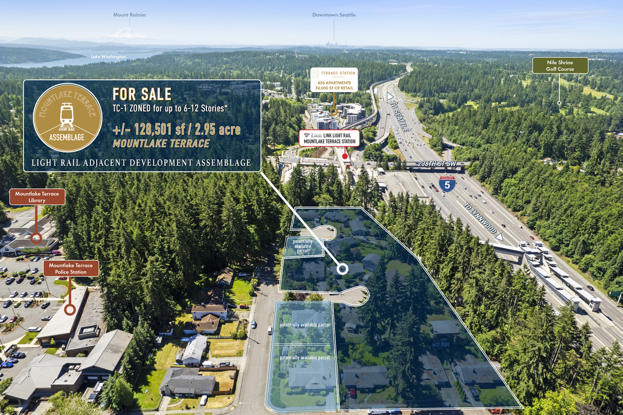 Uunique 12-parcel development assemblage in Mountlake Terrace’s Town Center Zoning District 1, directly north of the new Sound Transit Lite Rail Station at I-5 and 236th St SW. This 8.5 mile section is estimated to be completed in 2024 and will link Mountlake Terrace with Seattle, SeaTac, Lynnwood, Mercer Island and Bellevue. The assemblage is comprised of twelve single-family home owners who are cooperating with each other for marketing purposes to bring this 128,501 SF of land, zoned TC-1, to the market. As part of the Town Center Subarea Plan, the City of Mountlake Terrace is planning a pedestrian connection through Veteran’s Memorial Park starting at the entrance to the assemblage leading to the Light Rail Station. The opportunity to purchase twelve single-family homes in a prime devel