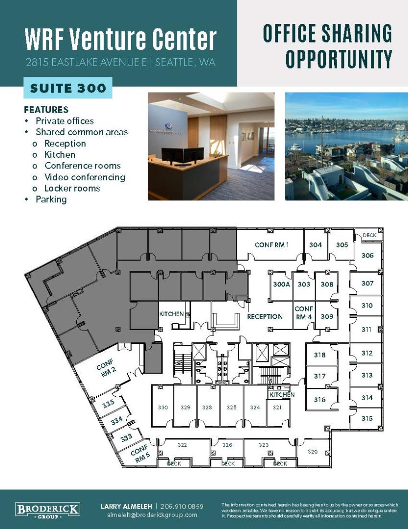 + Private offices + Shared common areas + Reception + Kitchen + Conference rooms + Video conferencing + Locker rooms + Parking