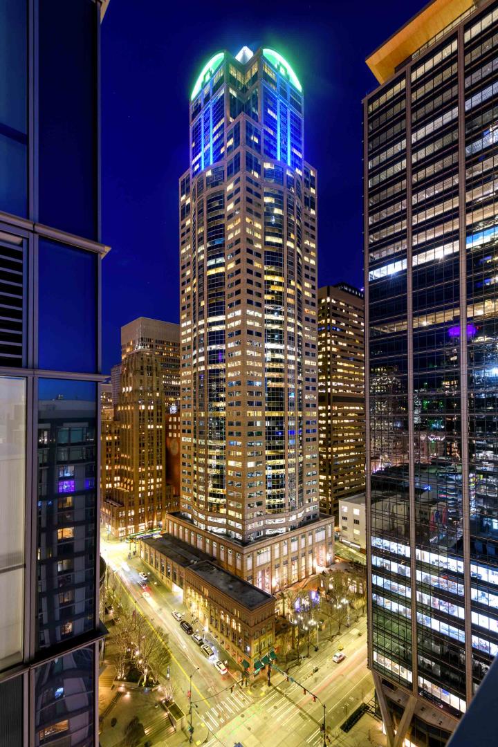 This 55-story, classically designed tower has commanding views of Elliott Bay, Lk Union, & Cascade and Olympic Mts. The granite emerald-green-glass building features a pedestrian plaza w/ three levels of shops, services & rooftop gardens.