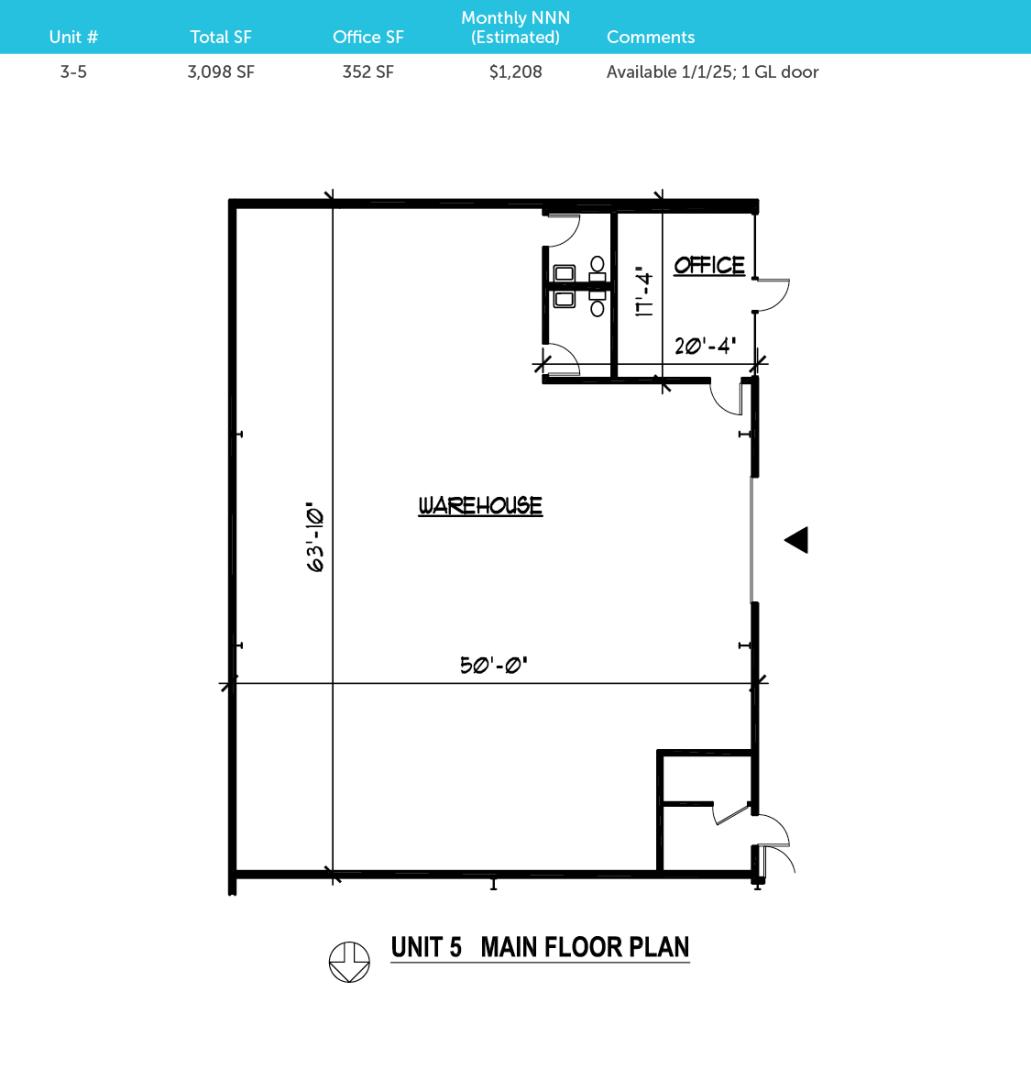 Unit#: 3-5 Total SF: 3,098 SF Office SF: 352 Monthly NNN (Estimated): $1,301 Loading: 1 GL door Available: Now PROPERTY FEATURES: • Small bays with office area and restrooms • Grade-level loading (12’x14’) • Flexibility for industrial users • 208-V, 3-P power • 14’ - 20’ ceiling height for most bays • Insulated buildings • Close proximity to major highways