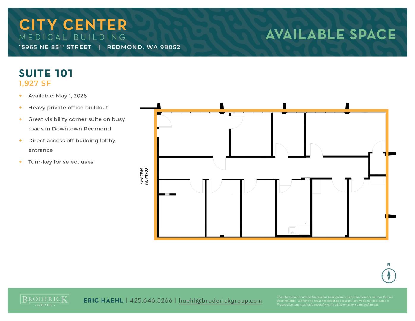 - Great visibility corner suite on busy roads in Downtown Redmond - Direct access off building lobby entrance - Turn-key for select uses