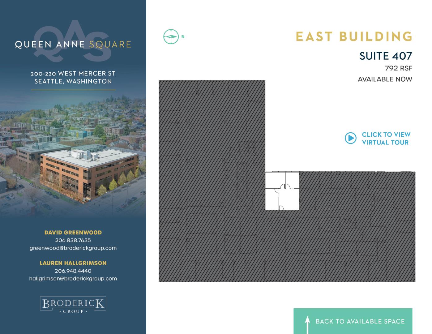Two-building complex along with 220 West Mercer. Features include covered parking in a secured/card-key access garage. Lush landscaping surrounds the central plaza with outdoor seating and wireless internet for tenant enjoyment. Located in Seattle`s hig