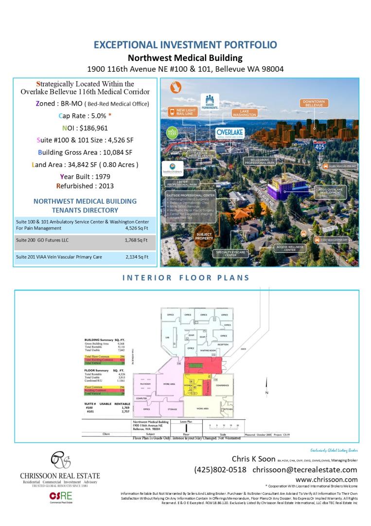 Prime Northwest Medical Building Suite #100 & #101 With 4,526 Space, Backed By 6 Years Of Lease With 2% Annual Increase. Zoned BR-MO (Bel-Red Medical Office).Northwest Medical Building Commercial Condo Comprised 4 Units On 2-Floor.Fully Tenanted.Strategic