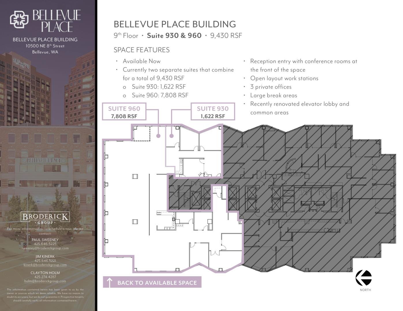 o Available Now o 9,430 RSF o Reception entry with conference rooms at the front of the space o Open layout work stations o 3 private offices o Large break areas o Recently renovated elevator lobby and common areas