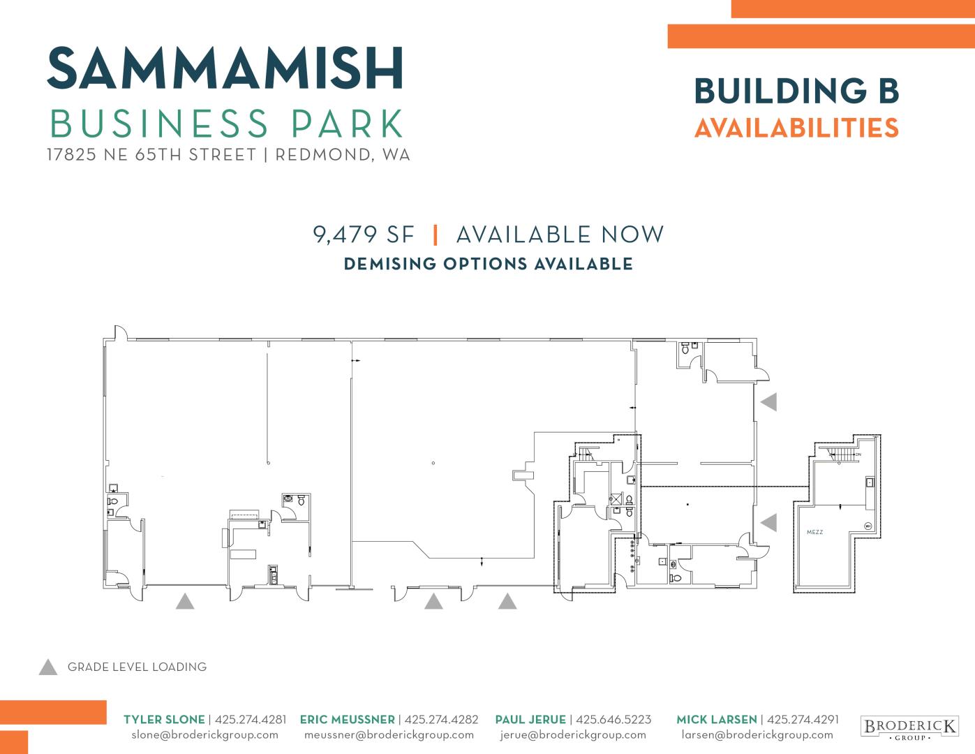 + Demising options available + Reception Area, 3 Private Offices, and Mezzanine Storage