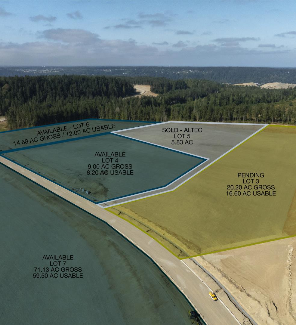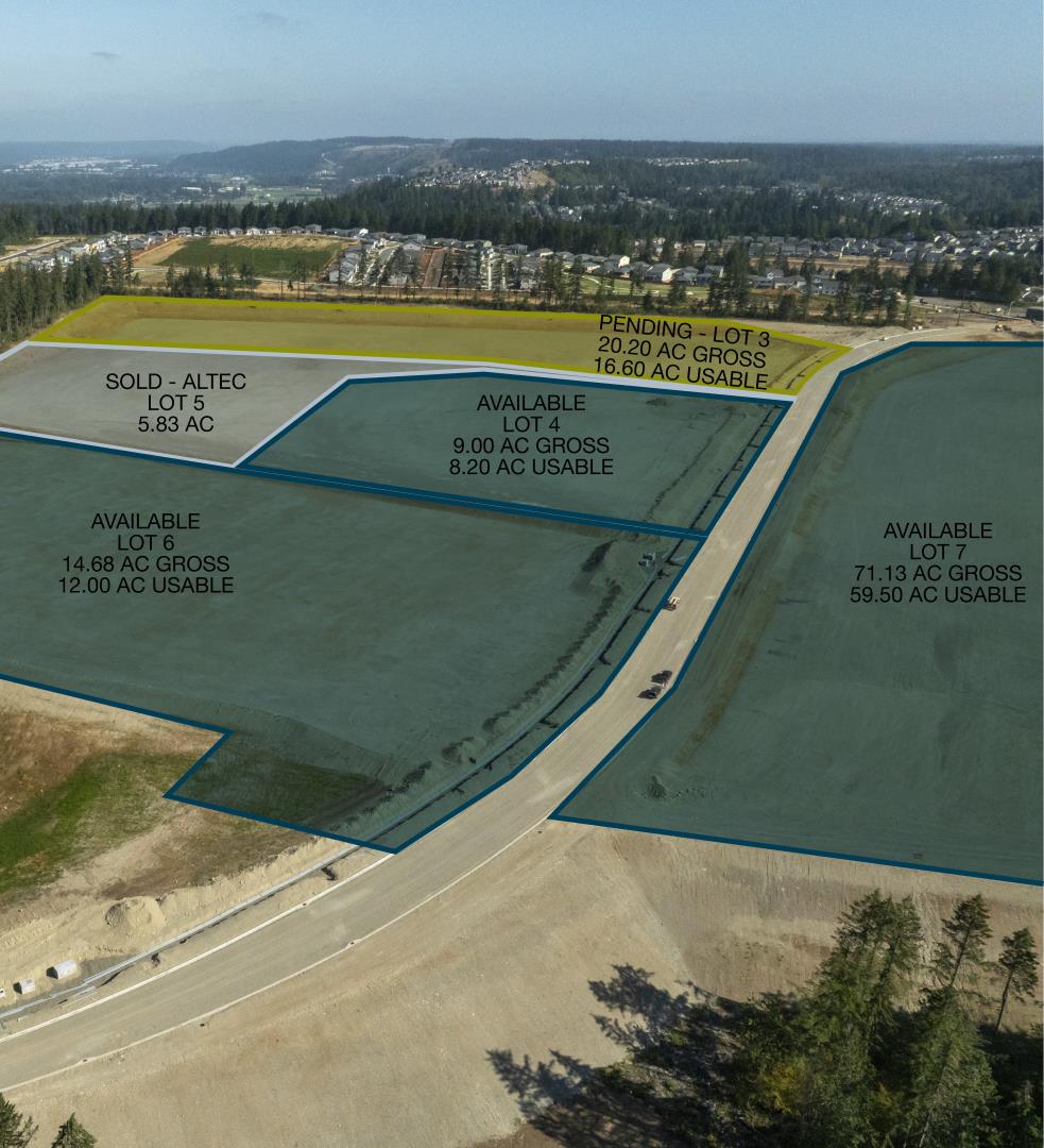Lot 7 - 71.13 AC Gross / 59.50 AC Usable Sale Price: $20.00/USF Located in Tehaleh, a 4,700 acre planned community and the 120 Acre Tehaleh Industrial Park Pad ready finished site Ideal for yard use, manufacturing or assembly Falling Waters Boulevard & Rhodes Lake Road extension to SR 162/128th to be completed by December 2026 providing excellent site access Price includes: Grading to 1% to 2% slope, Street frontage improvements and landscaping, Utility stubs to site, Offsite master storm retention, Sale calculation on “Net Usable” land (less than 3% slope) Sand and Gravel base Newly developed property with CC&Rs and Commercial Owners Association for value protection